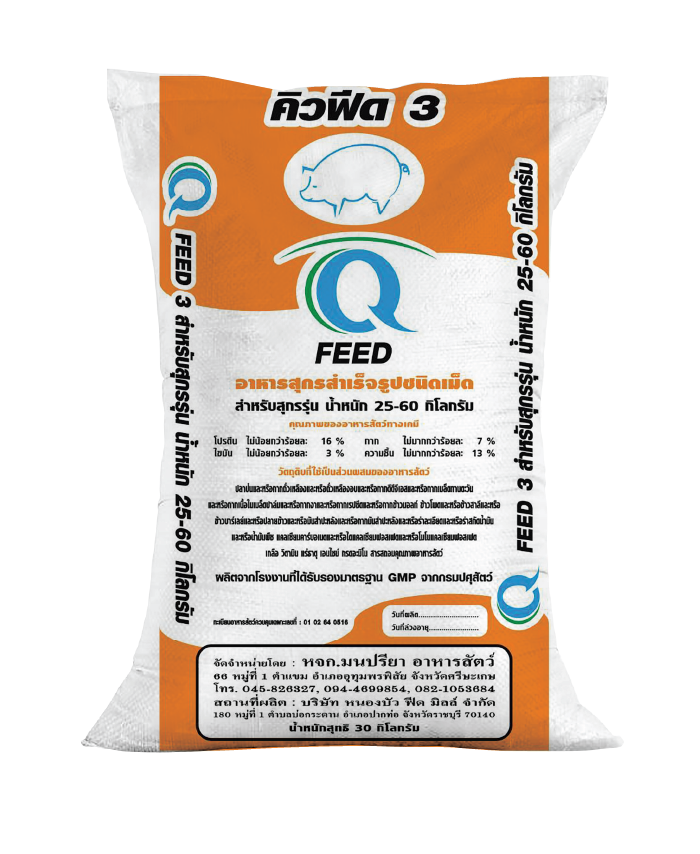 อาหารสุกรรุ่น 16% Protein สำหรับสุกรรุ่น น้ำหนัก 25 ถึง 60 กิโลกรัม คิว ฟีด 3 Q Feed 3